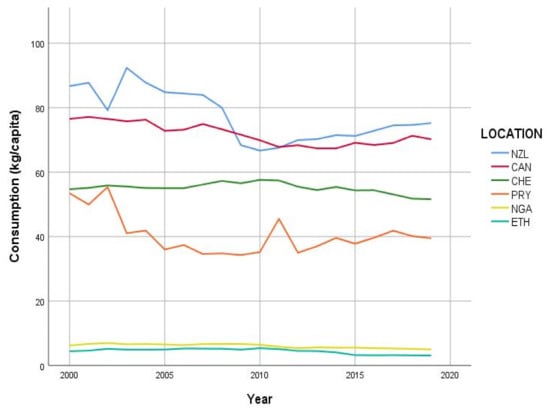 Of the countries that were reducing their meat consumption in the 2000–2019 period, we hypothesize two types of reasons. First, the countries Ethiopia, India, Nigeria, and Paraguay have seen little or no growth in GDP and have growing populations, hence, there is less meat available per capita. People in Paraguay experienced the biggest reduction in meat consumption, particularly beef and, to a lesser extent, poultry, due to export orientation and weather calamities. Second, the countries Canada, New Zealand, and Switzerland may have reduced consumption because of the contribution that meat production makes to global warming, reduced food security, animal welfare, and animal ethics [27]. It is official government policy to restrict the consumption of animal products in Canada (red meat), New Zealand, and Switzerland [39]. However, Canada also has a healthy-eating strategy, and although it makes it clear that changes are needed in saturated fat intake, there is no explicit mention of meat [40]. This may be due to government lobbying. Of the ten most influential lobby groups in Canada, two are representatives for the cattle and poultry industry, and a third is an animal welfare advocacy group [41]. Hence, it can be assumed that government officials in Canada are under pressure from both sides regarding the future of the meat industry.