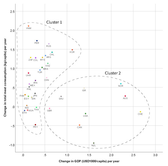 Hierarchical cluster analysis dendrograms and agglomeration schedules for total meat (Supplementary Table S10 and Supplementary Figure S1) and for each meat type showed an inconsistently large increase in the measure of dissimilarity between clusters in the grouping of all countries. Two clusters were indicated (Figure 3) that were largely similar across meat type, except for UK, Korea, and Saudi Arabia which varied by meat type in the cluster they were assigned to (Supplementary Table S11). Cluster 1 comprised mostly countries with relatively small increases in GDP per capita over time and increases in meat consumption. It covered 26 countries. Cluster 2 comprised countries with greater changes in GDP per capita and variable (positive or negative) changes in meat consumption. For total meat consumption, Cluster 2 comprised Australia, Canada, Switzerland, UK, Israel, Norway, New Zealand, Saudi Arabia, and USA. Figure 3 displays a scatterplot of the relationship between per capita change in GDP and in total meat consumption. Among Cluster 1 countries, there was a significant association between per capita change in GDP and change in total meat consumption, with an increase of USD 9795 (SE 2148, p = 0.006) per year associated with a 1 kg/capita/year increase in total meat consumption (Table 5). The constant was USD 25,003. There was no association between change in GDP per capita and change in total meat consumption in Cluster 2 countries (p = 0.84).