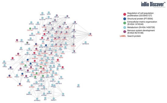The protein composition of the extract was analyzed by mass spectrometry (MS) using an Orbitrap Elite (Thermo Fisher Scientific, Massachusetts, MA, USA) connected to a Water Acquity HPLC, according to the methodology described in the previous article [9]. Obtained data were deposited in the PRIDE repository under PXD015146. The top 100 protein identified in the CEME was grouped on the proteins associated with cell proliferation, metabolism, extracellular matrix organization, nervous system, etc. The protein–protein interaction network analysis was performed in inBio Discover™.