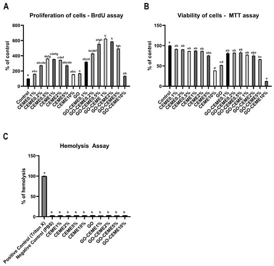 Cell proliferation was analyzed with the BrdU assay based on the quantitative measurement of DNA synthesis by detecting the thymidine nucleoside analog incorporated into the DNA of dividing cells during the S phase. The obtained results showed that the CEME extract, administered at 0.5%, 1%, and 2%, increased the proliferation of muscle cells. GO applied to the medium did not affect the proliferation of cells. However, administration of CEME in a complex with GO (GO-CEME1%; GO-CEME2%; GO-CEME5%) resulted in a significant increase in cell proliferation compared to the administration of the extract alone (Figure 3A).