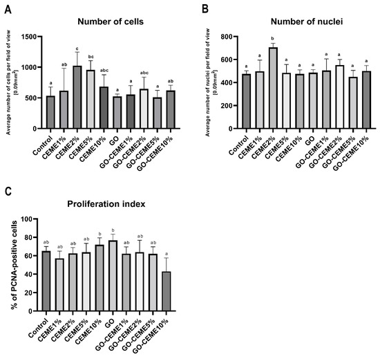 The analysis of immunohistochemical parameters showed a significant increase in the number of cells in the CEME2% and CEME5% groups, calculated on microscopic images per unit area (field of view, 0.09 mm2), compared to the other groups (Figure 5A). In the CEME2% group, a greater number of cell nuclei was also observed (Figure 5B). The cell proliferation index, measured by determining the number of PCNA-positive nuclei versus the total number of nuclei, did not increase in any group, compared to the control group. However, compared to GO-CEME10% the proliferation index increased in CEME10% and GO groups (Figure 5C).
