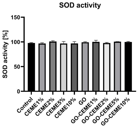 In the case of an excessive supply of glucose via glucogenic amino acids, the reserves accumulated in the liver and muscles, as a result of in ovo administration of CEME10% on day 1 of embryonic development, could reduce the glucose release from the yolk sac. Interestingly, a decrease in glucose levels was also observed under the influence of GO. Graphene oxide may react with glucose due to its reducing abilities [40], which in turn may reduce the level of free glucose in the blood. Most of the GO-CEME complexes did not affect the glucose level, which can be explained by the involvement of available oxygen groups by binding to CEME. In addition, CEME derived proteins could also be associated with GO and to a lesser extent be a source of glucogenic amino acids and, consequently, glucose. GO has numerous -OH, =O, -COOH groups on its surface [25]; however, they do not seem to be involved in the oxidation processes, leading to redox imbalance, as evidenced by the lack of changes in SOD superoxide dismutase activity. Studies by other authors found that as GO levels increased, the concentration of H2O2 decreased, which indicates that GO acts as an electron absorber in the system [41]. Moreover, GO also reacted preferentially with O2− [42]. Our studies also did not reveal the pro-oxidative activity of GO. It did not affect the activity of SOD, catalyzing the superoxide radical anion dismutation reaction.