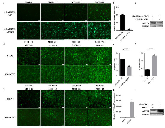 Screening of adenovirus MOI value. (a–c,e) Observe the expression of ACTC1 at mRNA level and protein level and the expression of GFP after adding interfering adenovirus to myoblasts. (e) Use Image J software to measure the gray value of protein bands. (d,f,h,i) Observe the expression of GFP and detection of infection efficiency at mRNA level and protein level after adding expressed adenovirus to preadipocytes. (f) Use Image J software to measure the gray value of protein bands. (g) Observe the expression of GFP after adding overexpressed adenovirus to myoblasts. Each experiment was performed in triplicate. Error bars represent s.e.m. ** p < 0.01. Olympus IX71 microscope (40×). Original western blot figures in Figure S1h.