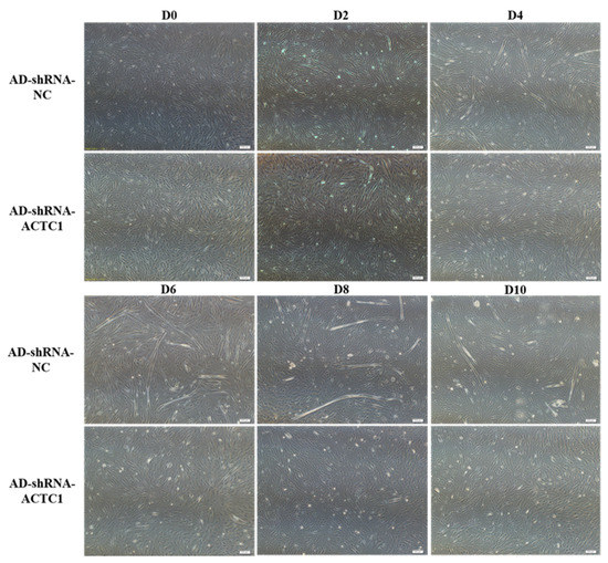 Myoblast differentiation after ACTC1 knockdown. The myotube formation in bright field was observed 0th, 2nd, 4th, 6th, 8th, and 10th day (D0, D2, D4, D6, D8 and D10) after ACTC1 knockdown (Olympus IX71 microscope 40×). Each experiment was performed in triplicate.