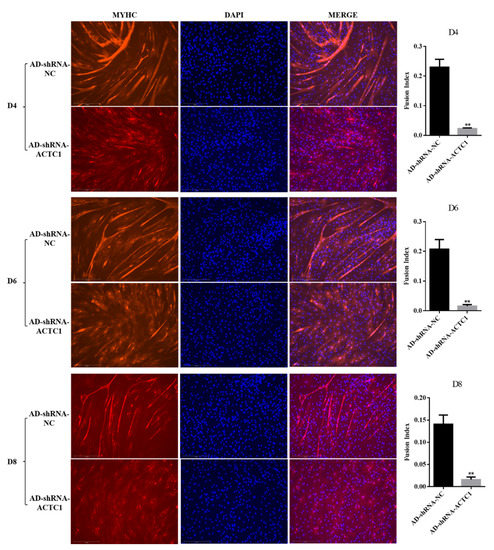 The results of MYHC immunofluorescence staining and fusion index of myoblasts on D4, D6 and D8 days after ACTC1 knockdown (Olympus IX71 microscope 100×). Each experiment was performed in triplicate. Error bars represent s.e.m. ** p < 0.01.