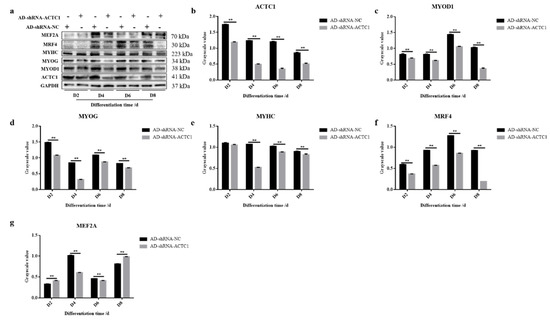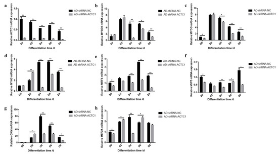 After knockdown ACTC1 in bovine myoblasts, the sizes and numbers of myotubes in the AD-shRNA-ACTC1 group were significantly lower than those in the AD-shRNA-NC group via brightfield imaging (D4, D6, D8, D10; Figure 2) and immunofluorescence staining (D4, D6, D8; Figure 3), with no significant differences observed at D0 or D2 (Figure 2). The myotube fusion index showed the same results (Figure 3). Myogenic marker genes, including MYOD1, MYOG, MYH3, MRF4, MYF5 and MEF2A, changed significantly at the mRNA (D0, D2, D4, D6 and D8) and protein levels (D2, D4, D6 and D8) after knockdown ACTC1 (Figure 4 and Figure 5). At the mRNA level, the expression of MYOD1, MYOG, and MRF4 decreased significantly (p < 0.05 or p < 0.01), while the expression of MYH3 and CKM increased initially at D2 (MYH3: p < 0.01; CKM: p < 0.05), then decreased significantly in the later stages (p < 0.05 or p < 0.01). MYF5 increased significantly on D6 (p < 0.05 or p < 0.01) but decreased significantly in other periods (p < 0.01). The expression of MEF2A gene changed significantly depending on the day, with expression on D0 and D4 decreasing significantly (p < 0.01) and increasing significantly on D2 and D6 (p < 0.05). At protein levels, the corresponding differences can also be seen with the mRNA level (Figure 5).