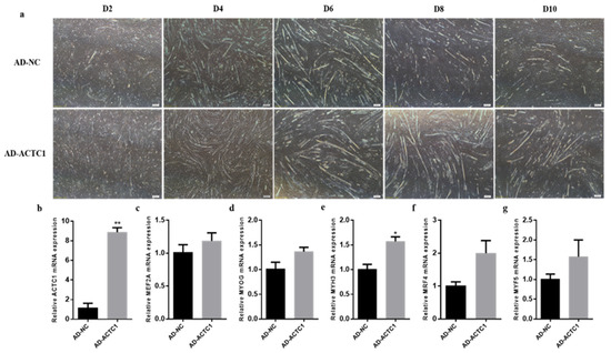 After overexpression ACTC1 treatment, myotube formation was observed on D2, D4, D6, D8 and D10 (Figure 6a). While there was no significant difference between AD-NC and AD-ACTC1 phenotypes on D2, the sizes and numbers of myotubes formed in the AD-ACTC1 group were significantly higher than those in AD-NC group on D4, D6, D8 and D10. The myogenic marker gene MYH3 increased significantly (p < 0.05, Figure 6e) after treatment, while other marker genes showed no significant changes, although they showed an upward trend (Figure 6c,d,f,g). These results demonstrate that ACTC1 overexpression significantly promotes myotube formation, while ACTC1 knockdown significantly inhibits myotube formation.