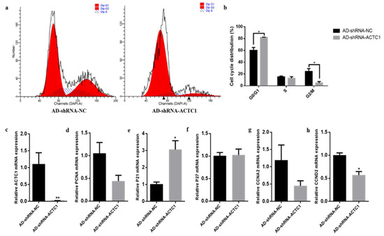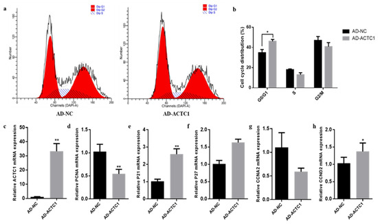 After ACTC1 knockdown, myoblast proliferation increased significantly in the G0/G1 phase (p < 0.05) and decreased in G2/M phase (p < 0.05) (Figure 7a,b). Cell proliferation marker gene mRNA detection found that P21 increased by 201% (p < 0.05; Figure 6e) and CCND2 significantly decreased (p < 0.05; Figure 7h), while P27, PCNA and CCNA2 did not significantly change (Figure 7d,f,g). After ACTC1 overexpression, the proliferation of myoblasts increased significantly in the G0/G1 phase (p < 0.05) but showed no significant changes in the S and G2/M phases (Figure 8a,b). Proliferation marker gene mRNA detection found that PCNA significantly decreased (p < 0.01), P21 significantly increased (p < 0.01), and CCND2 significantly increased (p < 0.05), while CCNA2 and P27 did not significantly change (Figure 8c–h). These results demonstrate that ACTC1 can alter the proliferation of bovine myoblasts.