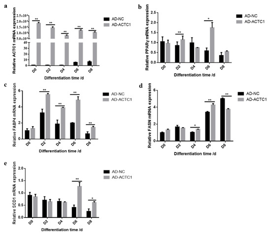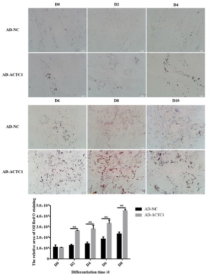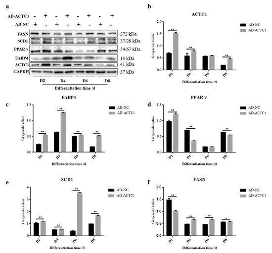 Oil red O staining results showed that the numbers and sizes of lipid droplets in the AD-ACTC1 group were significantly greater than those in the AD-NC group on D0, D2, D4, D6, D8 and D10 after induced ectopic ACTC1 expression (Figure 9). Moreover, lipid quantification results showed that, except for D0, there are extremely significant differences (Figure 10). The expression of adipogenic marker genes (PPAR γ, FABP4, FASN and SCD1) were significantly changed at both the mRNA (D0, D2, D4, D6 and D8) after ectopic expression (Figure 10): PPARγ increased significantly on D2 (p < 0.01) and D6 (p < 0.05); FABP4 increased significantly during adipocyte differentiation (p < 0.01); FASN increased significantly on D4 (p < 0.05) and D6 (p < 0.01), but decreased significantly on D8 (p < 0.01); and SCD1 increased significantly in the late stage of adipocyte differentiation (p < 0.01 or p < 0.05; Figure 10e). The results exhibit that ectopic expression of ACTC1 can significantly promote the formation of lipid droplets. At protein levels (D2, D4, D6 and D8), the corresponding differences with the mRNA level can also be seen (Figure 11).