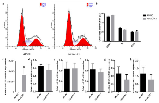 Ectopic expression of ACTC1 had no significant effect on the proliferation cycle of preadipocytes (Figure 12a,b) and induced no significant changes in the expression of proliferation the marker genes: PCNA, P21, P27, CCNA2 and CCND2 [29,30,31,32,33,34,35] (Figure 12d–h). These results show that ACTC1 gene had no effect on the proliferation of bovine preadipocytes.