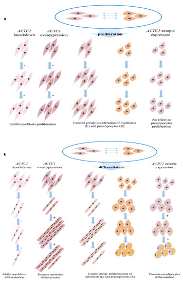 In this study, knockdown and overexpression of ACTC1 inhibited myoblast proliferation, and ectopic expression of ACTC1 had no significant effect on the proliferation of bovine preadipocytes (Figure 13a). However, ACTC1 is positively correlated with myoblast differentiation, especially having a significant promoting effect on myotube formation in the middle stage of differentiation and a significant maintenance effect on myotube in the later stage of differentiation; in addition, ectopic expression ACTC1 could significantly promote the formation of lipid droplets, which was positively correlated with preadipocyte differentiation (Figure 13b), and this was consistent with the results of myoblasts inducing the expression of ACTC1 in preadipocytes in the previous muscle-fat dialogue.