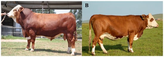 Cattle are vital agricultural economy species worldwide, providing meat, milk, and labor for humans. China has abundant cattle genetic resources, with rough feeding tolerance, excellent meat quality, and strong adaptability []. For a long time, Chinese native cattle have been used as draft animals, ignoring the utilization of meat performance, and resulting in lower beef production performance compared to commercial cattle breeds. Hybridization is an important method for improving the desirable performance and overall genetic variation of cattle breeds []. Crossbreeding breeds combine the beneficial traits/genes of their purebred parental breeds, and have more superior production capacity than their parental inbred lines under the effect of heterosis [,]. Therefore, the introduction of excellent beef cattle breeds to cultivate specialized beef cattle breeds has become an important way to elevate the individual production efficiency of beef cattle.