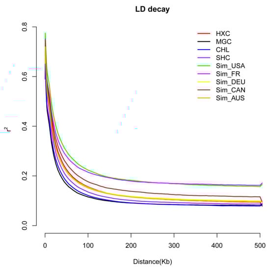 Genetic diversity is the basis for species evolution to adapt to the environment and an important reference index to evaluate the status of germplasm resources []. Our analyses revealed the MAF, expected heterozygosity, observed heterozygosity, and inbreeding coefficient of Huaxi cattle were 0.2557, 0.3754, 0.3402, and 0.0535, respectively, which were at the medium level of polymorphism information content among the nine cattle populations in this study. It has been reported that the heterosis produced by hybridization of parental inbred lines conferred the offspring higher genetic diversity [,]. We found that the observed heterozygosity of Huaxi cattle exceeded the expected heterozygosity under the Hardy–Weinberg equilibrium. Hence, crossbreeding is still an important method to expand the genetic variation of modern cattle breeds []. High-intensity artificial selection might promote genetic progress, but it could lead to an increase in the population inbreeding level []. Huaxi cattle have undergone generations of artificial selection in the breeding process in recent years. So far, the inbreeding level of Huaxi cattle is relatively low compared to the three commercial beef Simmental cattle populations in America, Canada, and Australia. Additionally, LD decay patterns of different breeds reflected the corresponding unique breeding selection history and population structure, and artificial selection can promote the increase in LD in the population [,,]. We observed that Huaxi cattle showed a faster LD decay rate relative to Montbeliard cattle, Canadian Simmental cattle, and American Simmental cattle, which indicated that the degree of selection intensity of Huaxi cattle was lower than that of commercial Simmental cattle.