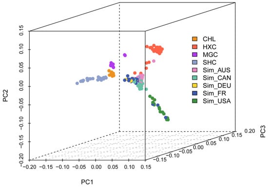 To investigate the cluster patterns among the animals analyzed, principal component analysis (PCA) was conducted (Figure 3). In the first dimension, Huaxi cattle and the five Simmental cattle populations obviously separated from non-Simmental lineage cattle (Mongolian, Charolais, and Sanhe cattle). The second dimension distinguished Huaxi cattle from the five Simmental herds, and the results indicated that the individuals of the Huaxi cattle, Mongolian cattle, Sanhe cattle, and Charolais cattle were gathered separately.