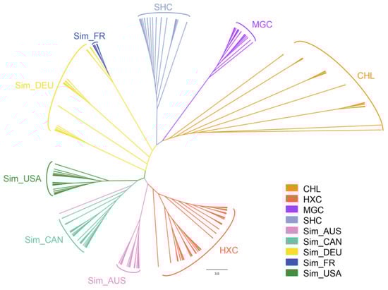 To understand the genetic background and genomic selection signatures of Huaxi cattle, we collected 228 individuals from Huaxi cattle (HXC, n = 55), its maternal ancestors including Mongolian cattle (MGC, n = 20) and Sanhe cattle (SHC, n = 25), and its paternal ancestors including Charolais (CHL, n = 24), Fleevicht cattle (Sim_DEU, n = 25), American Simmental cattle (Sim_USA, n = 25), and Canadian Simmental cattle (Sim_CAN, n = 25), as well as two similar populations, Australian Simmental beef cattle (Sim_AUS, n = 21) and dual-purpose Montbeliard cattle from France (Sim_FR, n = 8). Sample details were presented in Table 1.