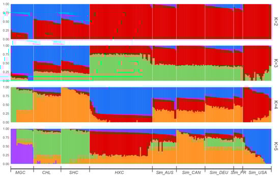 Next, to determine admixture degree in the nine cattle populations, STRUCTURE v2.3.4 software was used to perform the population admixture analysis. The hypothetical ancestral groups ranged from K = 2 to 5 (Figure 5). At k = 2, the clustering pattern implied that Huaxi cattle had high similarity with the five Simmental cattle populations and remarkable division from Mongolian Cattle, Sanhe cattle, and Charolais cattle. At K = 3, American Simmental cattle seemed to display different proportions of the genetic components compared to Huaxi cattle and other Simmental cattle populations. At K = 4, we observed that Australian Simmental cattle, Canadian Simmental cattle, Fleevicht cattle, and Montbeliard cattle sharing a higher degree of genetic similarity, while Huaxi cattle displayed different admixture component proportions among all populations, indicating that Huaxi cattle was distinguished from the other breeds and had its own unique lineage composition.