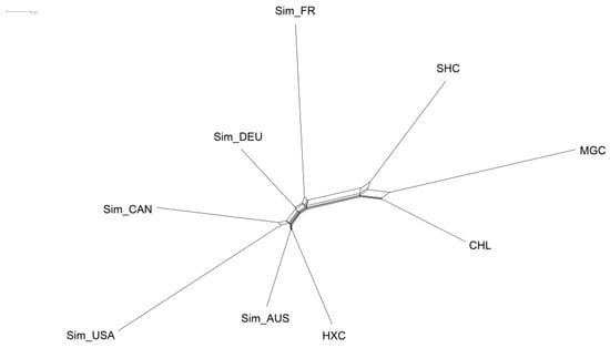 To explore the genetic variation at the population level, we further evaluated Nei’s genetic distance among the nine populations. The results showed that the Nei’s distance between the nine populations ranged from 0.0775 to 0.2103 (Table S1). Among them, Huaxi cattle had the smallest genetic distance with Australian Simmental cattle (0.0775) and the largest genetic distance with Mongolian cattle (0.1737). The NeighborNet graph was then constructed based on Nei’s genetic distance values (Figure 6). We observed that Huaxi cattle, Australian Simmental cattle, Canadian Simmental cattle, and American Simmental cattle were in the same sub-cluster, as well as Fleevicht and Montbeliard cattle were in another sub-cluster. In accordance with the results of NJ tree and PCA, Mongolian cattle, Sanhe cattle, and Charolais cattle have a relatively far genetic distance from Huaxi cattle.