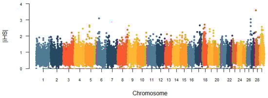 To detect the genomic regions under selection in the breeding process of Huaxi cattle, two analysis methods including the integrated haplotype score (iHS) and composite likelihood ratio (CLR) test were applied for selection signature analysis. The iHS estimates the relative decay of extended haplotype homozygosity (EHH) of the ancestral and derived core allele [,]. The CLR test has a high detection effect on the variants near fixation, which quantifies significant deviations from the neutral site frequency spectrum (SFS) []. In this study, BEAGLE v5.2 (https://faculty.washington.edu/browning/beagle/beagle.html, accessed on 10 October 2021) with default settings was used to impute missing alleles and infer the haplotype phase for all individuals of Huaxi cattle []. The iHS was estimated using the default setting of selscan; although, the maximum gap was set to 800,000 [,]. We also applied the norm module of selscan to normalize the iHS score, and calculated the average |iHS| score in 100 kb non-overlapping windows across the autosomes. Regions at the top 1% with the highest average |iHS| score and SNP numbers greater than 10 were regarded as candidate regions of positive selection []. For the CLR test, we employed the software SweeD v3.2.1 (https://cme.h-its.org/exelixis/web/software/sweed/, accessed on 10 October 2021) to calculate the CLR values for sites every 20 kb across each chromosome of the genome []. To define candidate regions, we divided the genome into 100 kb non-overlapping windows. In each window, the maximum CLR value was used as the test statistic according to previous studies [,]. We used the 99th percentile of the distribution of CLR scores as the threshold for the detection of candidate regions.