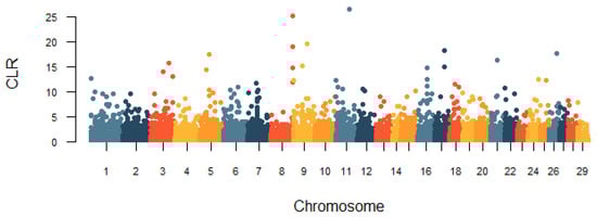 In this study, the genomic regions under the recent selection of the Huaxi cattle were determined by two methods, iHS and CLR. The genome-wide distribution of |iHS| values for 100 k non-overlapping windows on autosomes is depicted in Figure 7. In total, there were 248 candidate regions under the threshold of the top 1% that were identified, and we obtained 143 genes under selection in the iHS test (Table S2). Based on the cattle QTLdb database, we found that 14 genes were associated with important economic traits of cattle, including growth and development, carcass and meat quality, and milk quality (Table 2). The CLR statistic for 100 k non-overlapping windows in the genome is shown in Figure 8. We identified 247 positive selection regions with extreme CLR values using the top 1% criteria for the CLR test. The 68.6–68.7 Mb region of BTA11 had the highest CLR value (CLR = 26.57). Through gene retrieval, 199 potentially selected candidate genes were obtained in the CLR test (Table S3). Among them, we also observed some candidate genes related to reproduction, growth and development, carcass and meat quality, and immunity (Table 2). Notably, nine genes (KCNK1, PDLIM5, CPXM2, CAPN14, MIR2285D, MYOF, PKDCC, FOXN3, and EHD3) in fifteen overlapping genomic regions covered 1.5 Mb were jointly detected by both methods.