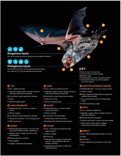 Most tissues are either metabolically inert or active. Metabolically active tissues continually regenerate and thus have a chemical composition that is continuously changing. Examples include the blood, muscles, liver, and wing membrane [187,188,189]. Comparatively, metabolically inert tissues are fixed after formation and are reflective of the conditions during that development period (e.g., fur) [187,188,189]. Breath, while not a tissue, is frequently sampled for intrinsic marker analysis and shares salient characteristics with tissues, so will also be discussed here [42,190,191]. Figure 1 presents a graphical summary of the tissue types that may be used for intrinsic marker investigations of bat ecology.