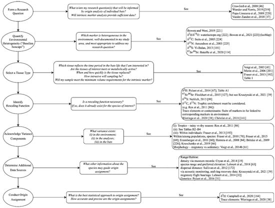 A generalized workflow for conception and implementation of a study using intrinsic markers to track migratory bat species. The far-right column lists bat-specific literature (except where more general literature is appropriate) that specifically addresses each stage [19,31,32,37,38,39,43,46,60,61,63,66,67,69,70,84,86,99,101,114,141,164,172,192,201,219,220,221,222,223,224,225,226]. Notice the extensive knowledge gaps that exist for the lesser used markers, especially in the last step “conduct origin assignment”. Steps in far-left column modified from Vander Zanden et al. [37].