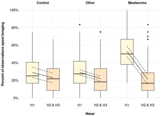 The percentage of observations spent foraging (including foraging active and foraging inactive) immediately after scattering was provided (H1) and later in the day (H2 and H3) for Control (no scattering), Other (scattering of shavings, whole wheat, alfalfa, or cabbage), and Mealworms (p = 0.001). Boxplots show medians, lower, and upper interquartile range of raw data. Whiskers indicate 1.5 times the interquartile range. Solid lines represent estimated means and dashed lines represent 95 % confidence intervals.