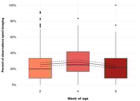 The percent of observations spent foraging (including foraging active and foraging inactive) at 2, 4, and 6 weeks of age (p = 0.001). Boxplots show medians, lower, and upper interquartile range of raw data. Whiskers indicate 1.5 times the interquartile range. Solid lines represent estimated means and dashed lines represent 95% confidence intervals.