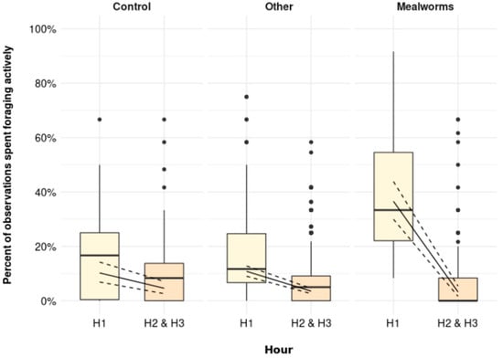 The percentage of observations spent foraging actively immediately after scattering was provided (H1) and later in the day (H2 and H3) for Control (no scattering), Other (scattering of shavings, whole wheat, alfalfa, or cabbage), and Mealworms (p = 0.001). Boxplots show medians, lower, and upper interquartile range of raw data. Whiskers indicate 1.5 times the interquartile range. Solid lines represent estimated means and dashed lines represent 95% confidence intervals.