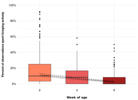 The percentage of observations spent foraging actively at 2, 4, and 6 weeks of age (p = 0.001). Boxplots show medians, lower, and upper interquartile range of raw data. Whiskers indicate 1.5 times the interquartile range. Solid lines represent estimated means and dashed lines represent 95% confidence intervals.