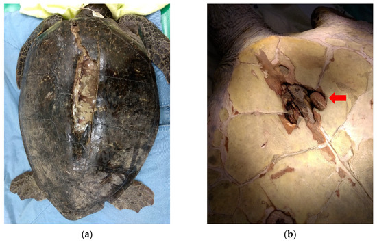 (a) After initial wound debridement, a large carapace defect with lung exposure was observed. (b) The left acromion process of the pectoral girdle (red arrow) was visible through the plastron defects located at the gular scutes and exhibited severe osteomyelitis with the presence of abundant pus.