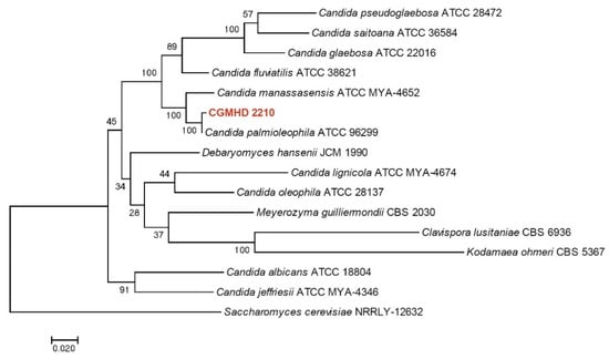 The sequence similarity between CGMHD 2210 and C. palmioleophila type strain ATCC 96299 was 100% for ITS and LSU, 99% for TEF1a, and 98% for RPB1. Figure 5 shows a phylogenetic tree constructed based on maximum-likelihood analysis using combined data sets for the ITS, LSU, TEF1a, and RPB1 sequences of CGMHD 2210 and selected species of Candida and related genera. MEGA 7 software [] was used for the analysis. Sequences used in this analysis are listed in Table 1. The isolate from the current turtle was in the same clade as C. palmioleophila and exhibited a good supportive value.