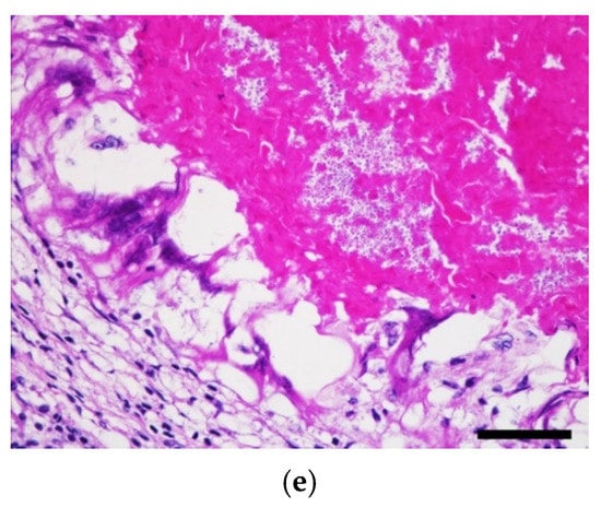 The postmortem examination revealed a 15 × 5 cm-large, triangular open wound in addition to fractures affecting the vertebral scutes of the carapace with granulation tissue formation. Four irregular- and variably-sized puncture wounds were observed at the gular, humeral, pectoral, and femoral scutes of the plastron (Figure 6a). The above-mentioned wounds penetrated into the subjacent soft tissues and bones, with caseous materials. The trachea and bronchi were filled with frothy fluid and both lung lobes were wet and heavy. On cut sections of the lungs and brain, multiple 0.2 × 0.2 × 0.2 cm, irregularly shaped, beige to yellowish nodules were noted (Figure 6b,c). The bilateral acromion processes and left ilium process were deformed and, respectively, replaced by approximately 8 × 5 × 5 cm and 5 × 5 × 5 cm encapsulated masses containing fragile caseous materials. The articular surfaces of both humeroradial joints and the left hip joint were rough with caseous materials (Figure 6d). There were no additional macroscopic lesions noted in other organs.