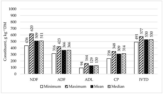 Mean, median, minimum, and maximum values of nutritive value of HSM are presented in Figure 1. Source had no contribution to variance for NDF, ADF, ADL, or CP (Table 2; p ≥ 0.20). However, batch within source contributed to variation for NDF (μ = 50.9%; p = 0.01), ADF (μ = 36.8%; p = 0.01), ADL (μ = 12.9%; p < 0.01), and CP (μ = 30.9%; p < 0.01). Regardless of the differences in nutritive value, there was no contribution to variation (p ≥ 0.23) of any measured effect on IVTD (μ = 53.0%). Therefore, while variation existed among HSM samples with respect to nutritive value, digestibility was not affected.