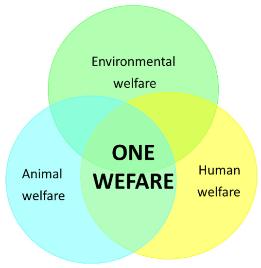Therefore, the main pillars of organic production animal welfare, environmental impact and human welfare are contained within the current concept of “One Welfare”, which is becoming very innovative in productive chains (Figure 1). In fact, the One Welfare concept is based on the promotion of direct and indirect links between animal welfare with human welfare [1] by considering environmentally friendly farm systems. Moreover, One Welfare also supports other important global issues, such as: food security, sustainability, reducing human suffering and improving productivity within the farming sector by applying high welfare standards.