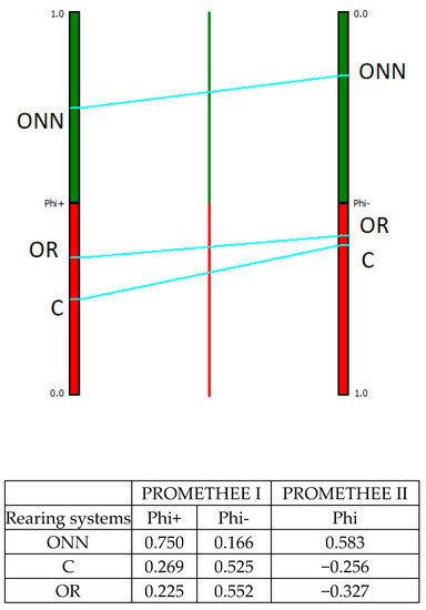 In reference to the animal welfare category (Figure 3), the multicriteria analysis results demonstrated the clear superiority of ONN in comparison to the other two alternatives, which presented negative net values. Even considering the Phi+ and Phi- values, the ONN resulted in much higher Phi+ and much lower Phi- in comparison to OR and C. These two rearing systems exhibited similar values in terms of Phi-, and relatively close values in terms of Phi+, probably due to the use of the same genetic strain.