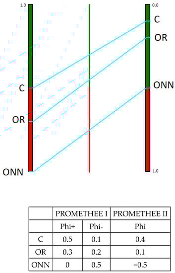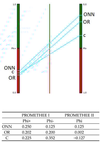As demonstrated in Figure 2, the outputs of the PROMETHEE I are two outranking flows: the positive outranking flow (Phi + (a)) represents the outranking power of an alternative over all the others: the higher the Phi + (a), the better the alternative [29]. The negative outranking flow (Phi − (a)) measures the weakness of an alternative, and how much it is outranked by all the others: the smaller the Phi − (a), the better the alternative [29].
