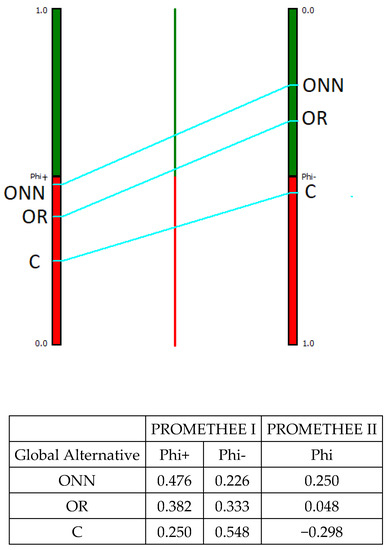 In relation to the overall evaluation obtained (Figure 6), the ONN system was found to the best alternative, in terms of both its partial and complete ranking, followed by OR and then by C. In particular, ONN demonstrated both the best positive and the best negative outranking flows; this resulted in a positive Net flow. The OR demonstrated a Net outranking flow value very close to 0, because it performed worse in both the negative and the positive flow compared to ONN. The conventional system performed poorly in both the indexes Phi− and Phi+ and was therefore the worst alternative based on the Phi (complete ranking).