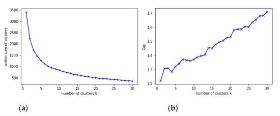 We then implemented the K-means clustering algorithm with the improvements proposed by [15], and we chose the number of clusters based on the gap statistic proposed by [16], analyzing up to 30 clusters and using the uniform distribution as the reference distribution. The results for the within sum of squares and the gap curve are shown in Figure 1.