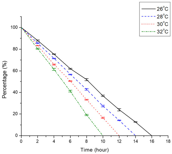 Percentage of feed retention in fish digestive system at an interval of two hours for each experimental group (26, 28, 30, and 32 °C). Error bars represent the SE of mean percentage values of five fish (n = 5) which were analysed at each time point.