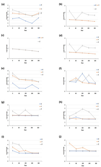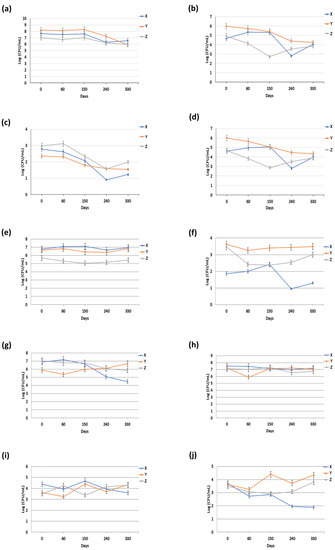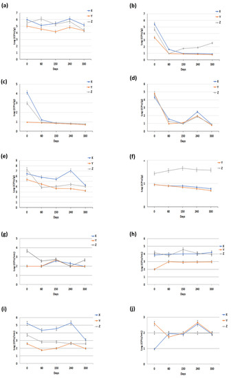 The microbiological analyses of the BMC provided by the three dairies have shown a similar trend about Escherichia coli, coagulase-positive staphylococci and psychrotrophic counting (Figure 3c,f,h). A similar and constant trend was also observed for coliforms, Enterobacteriaceae and Pseudomonas spp. in BMC provided by dairies X and Y, while a reduction of about 1 log was seen in BMC from dairy Z (Figure 3b,d,g). Concerning the total bacterial count, only in the BMC collected from dairy Z was a reduction of about 1 log recorded; in the remaining two dairies, by contrast, the total bacterial counts were constant (Figure 3a). Concerning lactic acid bacteria, a reduction of about 2 logs concentration was observed in all dairies (Figure 3e). By contrast, yeasts were present at different concentrations in the BMC aliquots from the three dairies; however, by the end of the study period (330 days), the higher concentrations had declined to the same level as the lowest (Figure 3i). A similar pattern was also observed in dairies X and Z with regard to mold concentrations (Figure 3j).