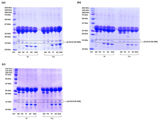 SDS PAGE of the matrices of the three dairies: (a) Dairy X; (b) Dairy Y; (c) Dairy Z. The results reported are referred to the beginning of the experiment (T0; fresh matrices, 0 day) and to the end of the freezing storage (T11; 11 months). The fragment γ4-casein selected for this study has been indicated as “β-CN (69-209)”. The matrices were: RM (raw milk), TM (thermized milk), PC (pre-mature curd), MC (mature curd) and BMC (Buffalo Mozzarella cheese). STD (Standard) is the Protein Molecular Weight Marker (10-250 kDa).