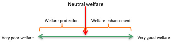 There are two key considerations that need to be addressed to allow for this reframing to be achieved. Firstly, veterinarians are currently trained to be experts at recognising, diagnosing, and addressing physical events or states that lead to survival-critical negative mental experiences such as pain, sickness, discomfort, hunger, thirst, breathlessness, and thermal stress. Most welfare indicators used by veterinarians align to physical/functional states in the Nutritional domain (Domain 1) or Health domain (Domain 3), for example, signs of nutritional inadequacy, functional impairment (e.g., lameness examinations), signs of disease, and injuries. The resultant unpleasant experiences of these physical/functional states are critically important, not only to the animal’s survival and productivity but also to its welfare. However, preventing or alleviating such unpleasant experiences will, at best, take an animal along the continuum from some degree of negative welfare state to a neutral state [21]. In other words, simply preventing or rectifying health and production problems does not provide for good welfare or what we might consider a ‘good life’ or a ‘life worth living’ for animals [27]; thus, we might characterise this current role of veterinarians as one of animal welfare ‘protection’ (Figure 3). To provide for good welfare, animals must also have some positive experiences; this is the ‘welfare enhancement’ to which we now aspire and to which veterinarians, if trained appropriately, can make major contributions (Figure 3).