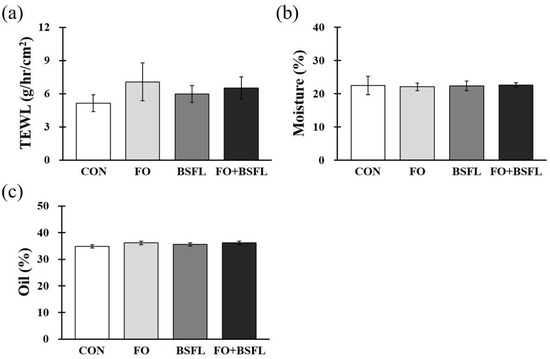 Figure 2 shows the effects of the feeding of FO and BSFL on skin status. At the end of the experiment, the TEWL, moisture, and oil levels of the groin, armpits, back, and ears were measured, and the measured value is expressed as the average of values determined at the four sites. The TEWL, moisture, and oil levels of each treatment group did not show significant differences compared to the control group (Figure 2a–c).