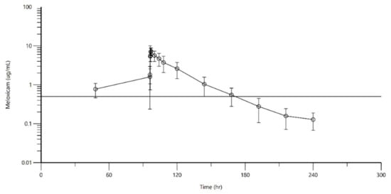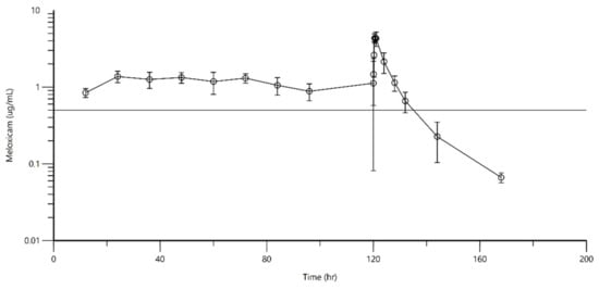 No negative side effects were observed during the study in either species. Pre- and post-drug administration behavioral observations by experienced husbandry staff revealed no adverse behavioral or appetite changes in any turtle. Complete blood counts and plasma chemistry profiles were found to be within normal limits prior to the study and approximately 1 week after the study was completed. The null hypotheses showed that blood analytes (paired data) were not significantly different before and after MLX treatment (Supplementary Tables S1–S3). After the last dose for the Kemps, the terminal half-life, maximum concentration, and time to maximum concentration were 7.18 ± 2.21 h, 4.77 ± 0.26 µg/mL, and 0.75 ± 0.27 h, respectively. For the greens, the terminal half-life, maximum concentration, and time to maximum concentration were 23.71 ± 2.81 h, 9.03 ± 2.59 µg/mL, and 1.29 ± 1.35 h, respectively; additional pharmacokinetic parameters are listed in Table 1. There were no statistical differences in any of the pharmacokinetic parameters for either group of turtles. The concentration–time curve for the Kemps is shown in Figure 1, and that of the greens in Figure 2. Throughout the multiple dosing, MLX concentrations remained above 0.57 µg/mL, a concentration targeted in humans for the analgesic and anti-inflammatory effects of the drug.