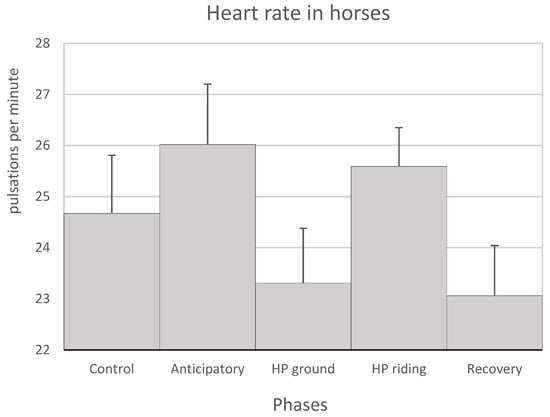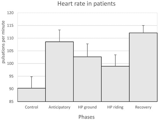 Mean values + SEM of the heart rate of the horses in the control and the anticipatory phases, the HP ground and HP riding phases (horse-patient interaction on the ground and on horseback, respectively) and the recovery phase. No significant differences were observed between the phases.
