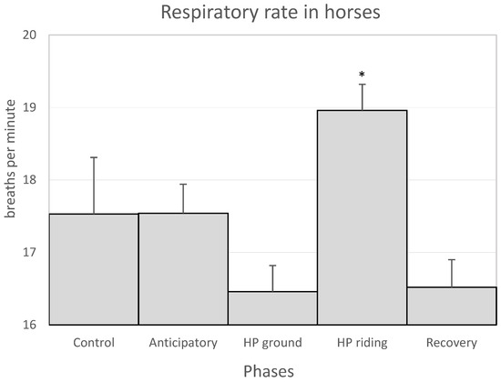 Mean values + SEM of the respiratory rate of the horses in the control and the anticipatory phases, the HP ground and HP riding phases (horse-patient interaction on the ground and on horseback, respectively) and the recovery phase. The asterisk indicates that the values were significantly higher in the HP riding than in the HP ground and recovery phases (p < 0.05).
