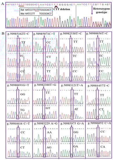 Sequence profiles of 13 variations in the BMP15 gene in Luzhong mutton sheep. (A) Sequence profile of the CTT base deletion at the ENSOART00000010201.1: c.58_60 in exon 1. (B) Sequence profile of the 12 base substitutions in intron 1 and exon 2.