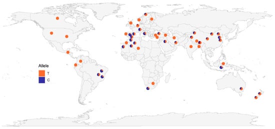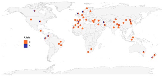 Of the SNPs that were significantly associated with litter size, two variations (c.352+342C>A and c.352+1232T>C) have been annotated in the Ensembl database. Therefore, the allele frequencies of these two SNPs in breeds from the International Sheep Genome Consortium and the NextGen Project databases can be downloaded and used. Combining this data with our sequence data for nine Chinese sheep breeds and Australian Merino sheep, the global geographic distribution map of the allele frequencies for these two SNPs was constructed. The results (Figure 2) showed that the highest frequency (f = 0.5) of the c.352+342C>A variation occurs in sheep of Western Europe, America, and Iran. The frequency of this variation in New Zealand is also relatively high (f = 0.311), however its frequency in Asia and Africa is low (f < 0.1). The variation c.352+1232T>C occurs more widely and its frequency is comparatively high across all continents (Figure 3). Its frequencies are the highest in southwestern Europe (f = 0.5–0.833), Indonesia (f = 0.75), South Africa (f = 0.75), northwestern Africa (f = 0.52–0.6) and eastern South America (f = 0.5–0.75). Its frequency in Asia and Australia is also relatively high.