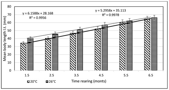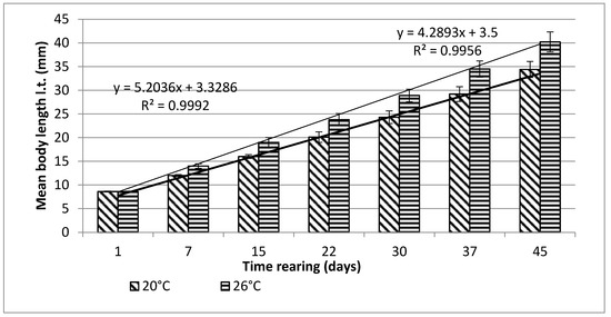 The rates of increments (the SGR and RGR) for the body length were calculated analogously. The increase in the total length (the ITL) per time unit [mm/d] was derived from the formula [22]: