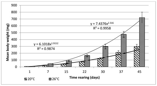 Stage I—Increase in the body weight of bitterling larvae during rearing (45 days) in water at different temperatures. Data are shown as means ± SD.